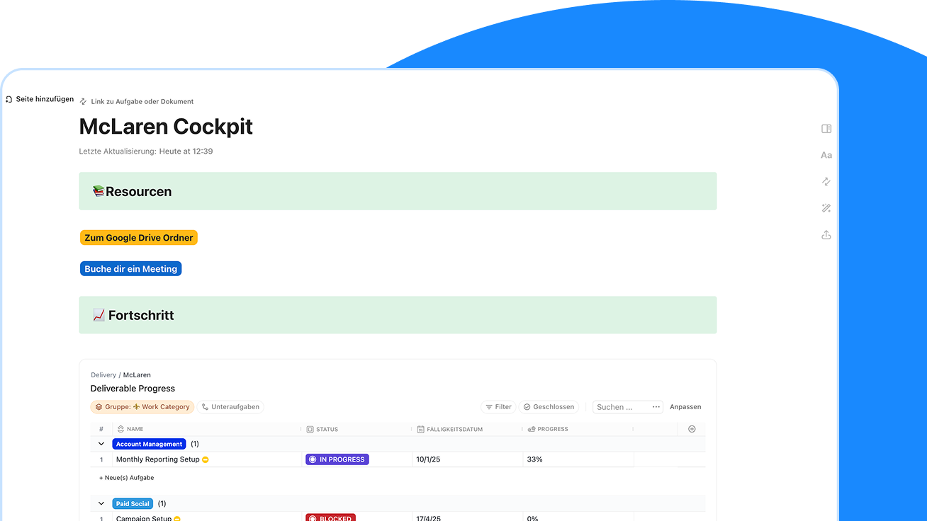 Wir führen euch sicher durch die Implementierung eines modernen Projektmanagement-Systems in ClickUp – eliminieren Chaos, schaffen Übersicht und sorgen für planbare, produktive und profitable Projekte.